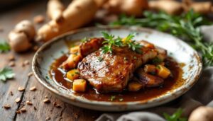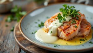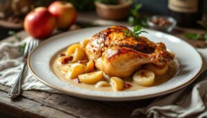 Le poulet vallée d’auge, véritable symbole de la gastronomie normande, séduit grâce à sa sauce onctueuse parfumée au cidre, à la crème fraîche et au calvados. Cette spécialité met à