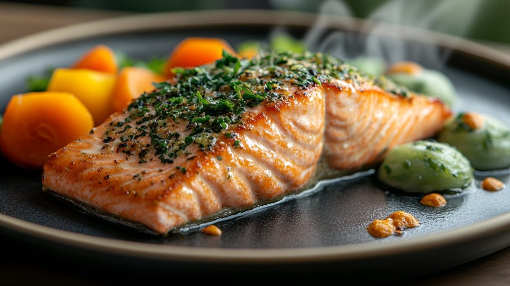 Ce mélange parfait entre gourmandise et diététique fait du saumon en croûte d’herbes avec légumes vapeur un allié précieux pour ceux qui souhaitent allier plaisir et santé.